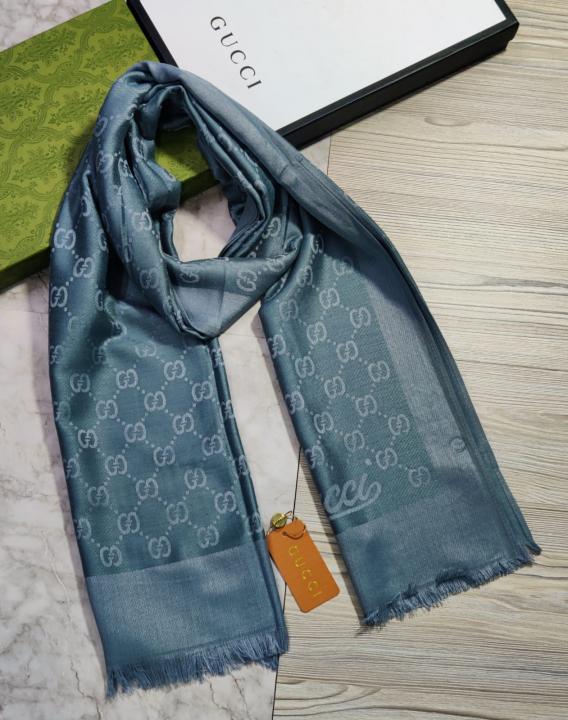 • Gucci_Steel_Blue_Tonal_Double_G_Monogram_Elegant_Design_Pashmina_Scarf_Pashmina_Cotton_Polythene_Scarf