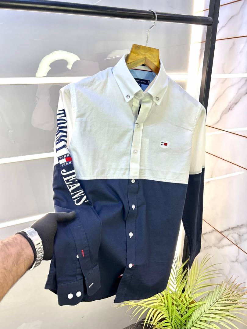 Tommy_Hilfiger White-navy Oxford Lycra Premium Printed Shirts F2734-WN